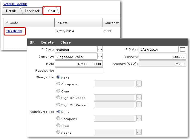 6. Move on to the Cost tab to view and edit the costs of the training. Click a cost record to view and edit the Cost, Date, Currency, Amount of the training and so on.