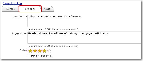 5. Move on to the Feedback tab to view and edit the Comments and Suggestion regarding the training, as well as the rating in the Rate section.