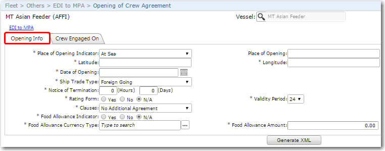 To open a crew agreement for a vessel: 1. From the HR Manager main menu, click EDI to MPA under the Fleet menu. 2. The EDI to MPA screen will be displayed. From the screen, click the Opening of Crew Agreement link. 3. The Opening of Crew Agreement screen is displayed. Use the Vessel search field to search and select the Vessel for which you want to open a Crew Agreement. The results of your search will be displayed on the screen. 4. Click New and then enter the following details under the Opening Info tab: