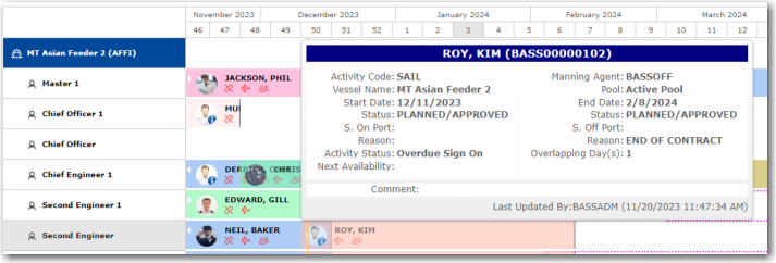 View Details: You can mouse-over a crew member's name in the schedule to view the details of his schedule for a particular period, for instance, to check if the crew member will be sailing or on a course on that date: