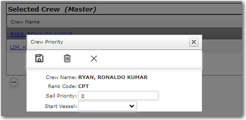 6. In the Vessel's Rank table, you can also indicate Sail Priority i.e. to set which of the selected personnel will go onboard the vessel first. Click the Crew Name and the Crew Priority pop-up window will be displayed. In the Sail Priority field enter the order in which this crew member will go onboard the vessel. In the Start Vessel field, enter the Vessel he will start on.