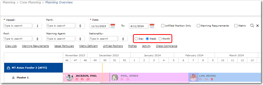 You can select more than one vessel if you are carrying out rotation planning of crew over multiple vessels.