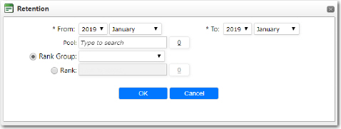 To generate an overview of your staff retention rate for a particular period: 1. From the HR Manager main menu, click Staff Strength under the Planning menu. 2. The Staff Strength screen is displayed. 3. Click the Retention Rate link. 4. The Retention pop-up window will be displayed where you can specify a time period and the Pool for the search. Then select either the Rank Group filter or the Rank filter. 5. Click OK to generate the report. You can then choose to open the report in a Microsoft Excel format or save the Microsoft Excel file to your computer.