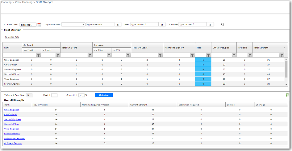 Using this feature you can see an overview of your fleet strength, i.e. total staff onboard vs staff on vacation based on a certain date. You can also calculate your staff surplus or staff shortage based on your fleet size. This information can also be exported to a Microsoft Excel file. A feature to track your staff retention rate during a particular period is also available in the System.