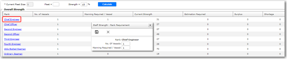 8. Move down to the bottom half of the screen. The bottom table provides a simulation functionality for the crewing department to gather information on the shortage or surplus of the crew in any given rank. This table enables you to calculate your staff surplus or staff shortage based on your fleet size for a one year duration at any point of time. In the Current Fleet Size field, enter your current fleet size. Then in the Strength+ field, enter the additional percentage of personnel required (which you may want to keep as a safety net over and above your normal staff required). Click each Rank and the Staff Strength - Rank Requirement pop-up window will be displayed. In the No. of Vessels field specify the number of vessels against which the calculation is to be carried out. In the No. of Ranks field, enter the number of people for the position that will be required for the specified number of vessels. Click Calculate. 9. The result populated in the table will give you a correct indication on whether you have a shortage or surplus of the crew in your fleet. 10. Clicking the Export to Excel icon will enable you to generate the data in a Microsoft Excel file.