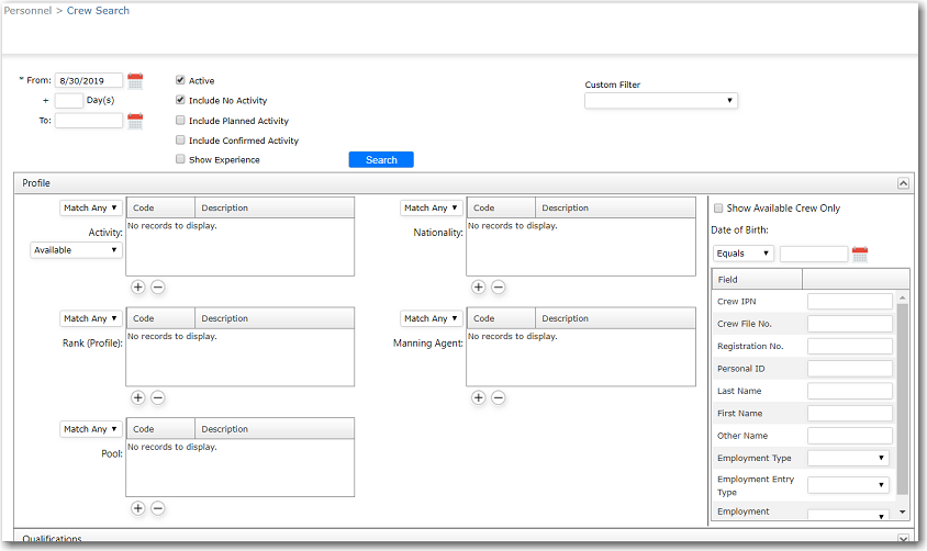 | To propose possible vacancies for crew members: 1. From the HR Manager main menu, click Crew Search under the Personnel menu. 2. The Crew Search screen will be displayed. Carry out a crew search based on Activity dates. To further filter your search, click any of the collapsible panes: 'Profile', 'Qualifications' and 'Experience' to display additional search filter sections. You can proceed to perform a crew search using a combination of the following fields: