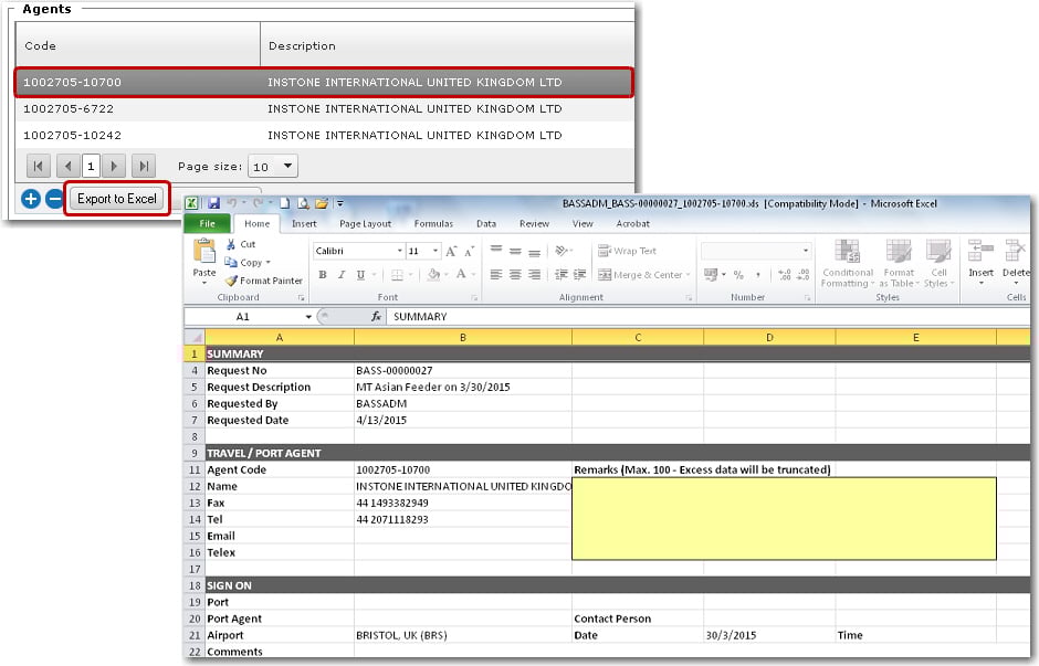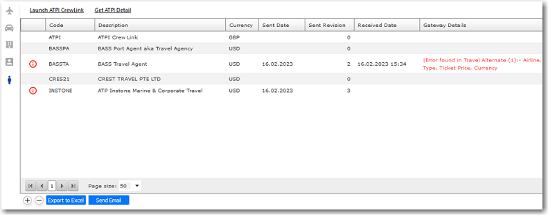 The date the email was sent will then be displayed in the Sent Date column. The Sent Revision column tracks the date of any revised versions of the details that were sent to the Travel Agent. The Received Date column tracks the date the quotation was received from the Travel Agent, while the Gateway Details column displays any errors related to the sending/receipt of the file through the BASSnet Gateway. Note: With the integration of ATPI or Instone (Maritime Travel Agent), when you click to send an email to the ATPI or Instone travel agent, the System will automatically attach an XML file of the travel information to the email that will be sent out to the travel agent. The travel agent can then specify the quotation details or provide alternate suggestions and transfer the file back to the System via the BASSnet Gateway. The quotation/travel alternate details will then be automatically populated into the Travel Alternates & Comparison screen. For ATPI, you can also click Get ATPI Detail to manually retrieve information from the CrewLink portal, or click Launch ATPI CrewLink to directly open and access the CrewLink portal. Alternatively, the travel agent can receive and manage travel requests and booking details via the web-based Travel Request Portal, and the agent can submit quotations through the portal. Note: If you make any changes at a later time, the 20 You can also export the travel arrangement details to Microsoft Excel by highlighting a travel agent and clicking the Export to Excel button (the Microsoft Excel file generated will be specific to the travel agent selected in the table). When the details are exported to Excel, the crew details of each crew member will be listed in individual tabs in the Excel sheet. Click the calculator icon to open the Travel Alternates & Comparison screen, or the bag icon to open the Travel Details screen.