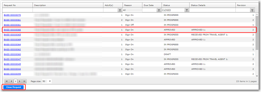 3. Click a record and click Close Request to close and complete the request