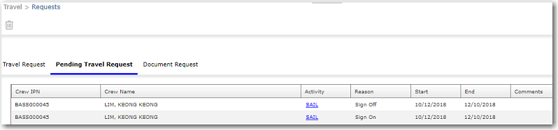 Note: One activity can only have a maximum of two travel requests, i.e. one travel request containing both Sign On and Sign Off travel or two separate travel requests, one for Sign On and one for Sign Off.