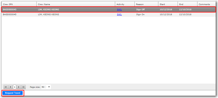3) On the Planned Crew Change screen, where you can select a crew member or multiple crew members planned for sign on/off on and then click the Request Travel button.