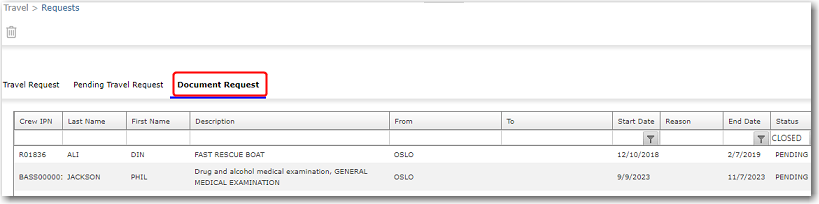 Viewing Travel Requests - Document Request tab