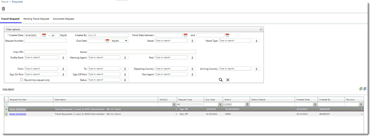 To view travel requests: 1. From the HR Manager main menu, click Requests under the Travel menu. 2. The Requests screen is displayed. Under the Travel Request tab, a list of travel requests that have been created in the System will be displayed. These are travel bookings that will be made with Travel Agents. 3. You can filter the listing using the collapsible Filter options section. 4. You can also click a record in the listing to open the Travel Request screen for that booking. 5. To close a travel request, highlight a travel request record which has an 'Approved' status (which occurs when all crew members in the travel request have been approved or cancelled) and then click the Close Request button. The travel request record will now have a 'Closed' status and can no longer be edited. Note: You can click the Export to Excel or Export to Word icon to export the travel request table to a Microsoft Excel or Microsoft Word format. Note: Unwanted travel request records can be deleted by highlighting the record and clicking the Delete icon. Note: Click the Crew Search link to perform a crew member search.