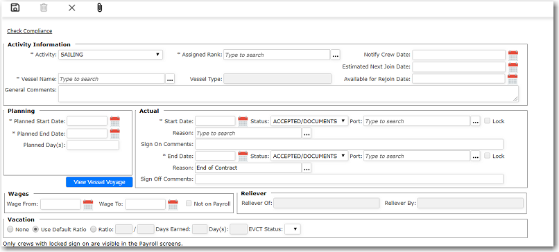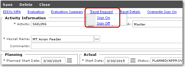 From the Activity screen, you can create a travel request for a single crew member signing on or signing off. You can make a travel request when creating a new activity for the crew member OR by using the Travel Request link for an existing activity.