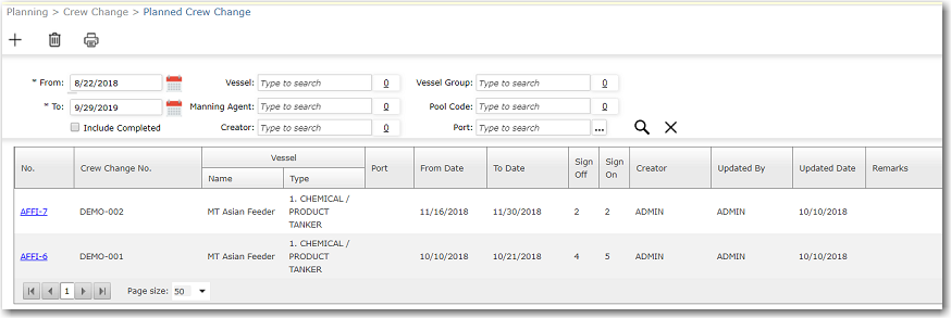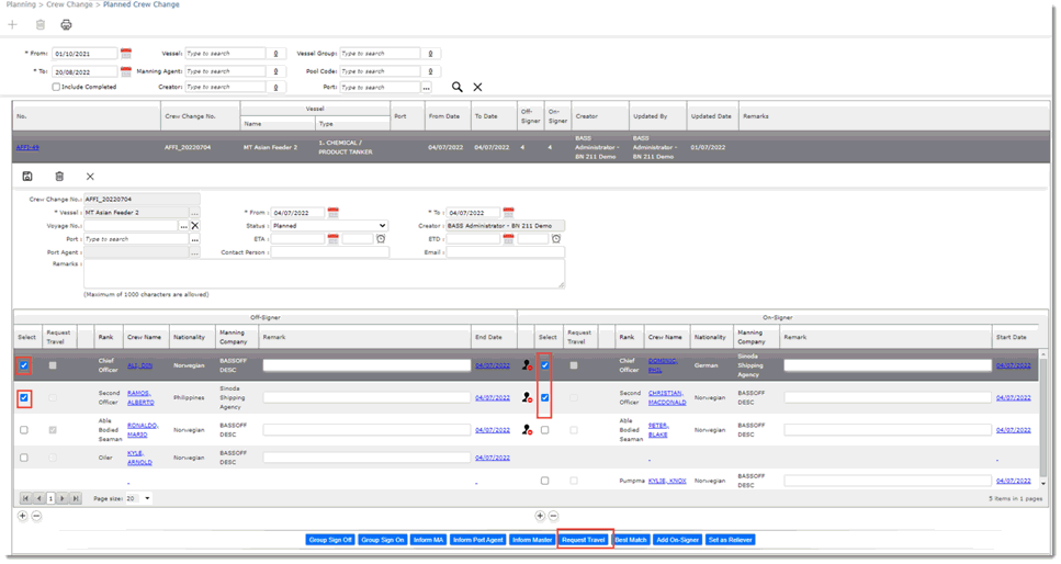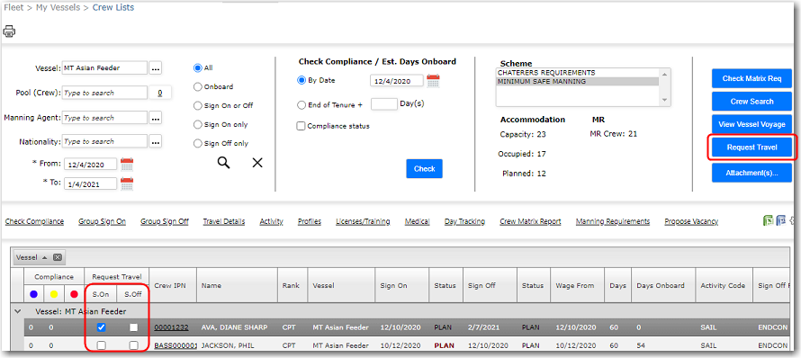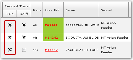 From the Planned Crew Change and Crew Lists screens, you can create travel requests for multiple crew members at one go.