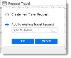 5. Click Save after you have completed your entries. 6. A Travel Request pop-up window will then appear asking you if you want to create travel requests/pending travel requests for the activity. Select the relevant radio buttons to make the travel requests and click OK. 7. The travel request that you have just created will now be available on the Requests screen in the Travel module (Travel - Requests). Proceed to the Requests screen in the Travel module and, under the Travel Request tab, click the travel request record that you just created. The Travel Request screen will then be displayed. Proceed to the Update a Travel Request topic to insert/edit the details of the travel request.