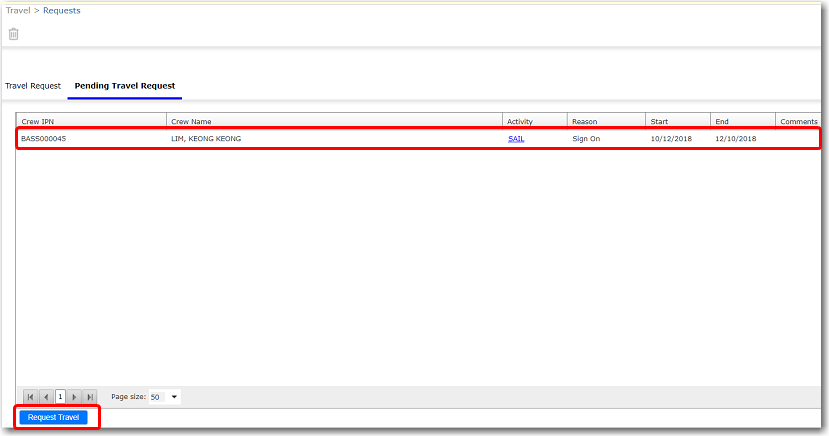 Creating a Travel Request from the Crew Lists screen