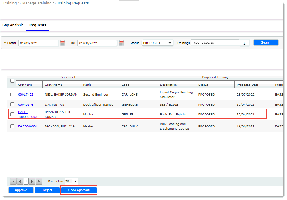 To undo a training that has been approved for a particular crew member: 1. From the HR Manager main menu, click Training Requests under the Training module. 2. The Training Requests screen will be displayed. Click the Requests tab and carry out a search for trainings that have been proposed based on a date range. 3. To specify a date range for the search, select the From and To date from the calendar Lookup functions. 4. Next, select 'Approved' from the Status drop down menu. 5. Click Search. 6. A list of personnel and their proposed trainings will be displayed. The Personnel column in the table displays the basic information of the personnel who have been proposed to attend the training. The Proposed Training column displays the following: