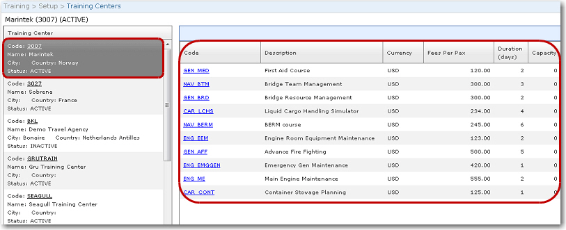 This feature enables you to define the courses that are offered by a Training Center. The training courses will then be available for selection under a particular Training Center when proposing training for crew members.