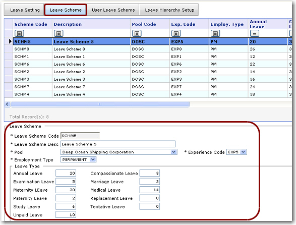 Screen Navigation: Leave Management - Leave Setup - Leave Scheme tab