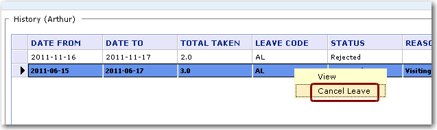 To cancel a previously approved leave application: 1. From the Leave Management menu, click My Leave. The My Leave screen will be displayed. 2. You will see a tree structure showing the employees that are your subordinates. If you do not have any subordinates, you will only see your name listed. Click on your name. 3. A menu will be displayed. Click History followed by Leaves and then select the Annual Leave. 4. Your leave history for the selected leave type will be displayed. You will be able to see the approved leave submissions as well as the rejected ones. 5. Click on the Approved record that you want to cancel and select Cancel Leave from the menu that is displayed. Please note that you cannot cancel past leave records. 6. The status of the leave record will then be switched to 'Cancelled'. The cancelled number of days will be added to your Leave Balance.