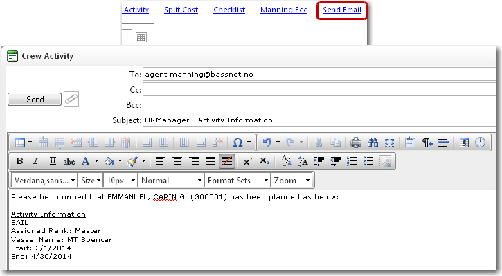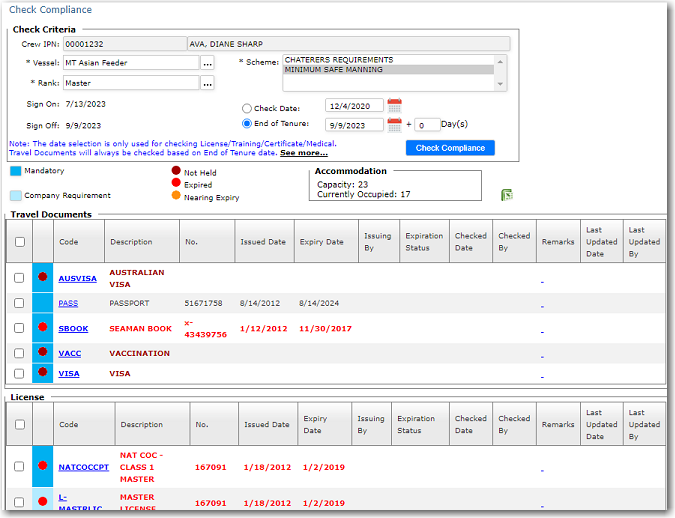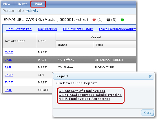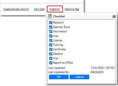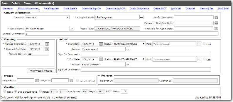 Note on the duration of the activity (as set in the Planned Start Date and Planned End Date fields): A back-end database-controlled configuration is available to allow you to specify the maximum length (in number of days) that can be set for an activity when planning it before an informational message is displayed by the System. For instance, if you specify this configuration as ‘365’ days and then attempt to create a new Activity with a duration that equals to or exceeds 365 days, the System will display a message indicating the length of the activity you are planning. You can choose to proceed or stop. This is to ensure that a realistic date is entered for the activity. Please note that this feature is a back-end database-controlled configurable feature. If you would like to explore the option of including this feature, please contact BASS Support. Note on change to Reliever: If a crew member who has been assigned as a ‘Reliever’ for another crew member is removed from the Reliever relationship because there is a change to the Vessel name for the Reliever’s relevant Activity (under the Activity Information section), a message will be displayed giving you the option to notify other users that the crew member has been removed as a Reliever. If you elect to send the notification, an email window will be displayed for you to send details of the Reliever’s removal to other Users. 5. Click Save after you have completed your entries. A pop-up message will be displayed asking you if you want to create an EVCT activity automatically, where you can either choose Yes or No. Then, a Travel Request pop-up window will be displayed asking you if you want to create travel requests/pending travel requests for the activity. Select the relevant radio buttons to make the travel requests or click None, then click OK. Note on Wage Validity: A back-end System configuration is available where, if the configuration is turned on, the System will check for any expired or invalid wages in an Activity or an Account Period and prompt you if any were found. The configuration can be set to either allow you to continue after the prompt or stop you from proceeding until the expired/invalid wages have been resolved. Please note that this feature is a back-end database-controlled configurable feature. If you would like to explore the option of including this feature, please contact BASS Support. Note: If your System Administrator has turned on the Check Compliance auto-prompt feature, then when you Save the Activity, the Check Compliance pop-up window will display the validity of the selected crew member's licenses or training certificates. This pop-up window will only be displayed upon saving the activity. The Check Compliance screen can also be accessed by selecting an Activity record and selecting the Check Compliance link. On the Check Compliance screen, the System will also display the number of cabins that are available/occupied in a vessel. This information is taken from the vessel’s Vessel Particulars – Owner tab – Manning sub tab – Accom. Available field. For travel documents that are expired or doesn't comply with the requirements, select the check box on the left and click Create Document Request to directly request for a compliant/valid document. Select the check box on the left and click Checked to indicate that you have checked the compliance of the document. The Checked Date, Checked By, Last Updated columns will be updated accordingly. To remove the Checked Date and Checked By information, click Clear. Note: The second left-most column in the tables on this screen indicate whether the document is Mandatory (column for the record is displayed in a blue shade) or a Company Requirement (column for the record is displayed in a light blue shade). Indicators will be displayed in this column when the document is Not Held (denoted with a red indicator) and Expired (denoted with a yellow indicator). A legend is available on this screen for information on the various colors used in this column: Note: You can select a particular Activity record on the Activity screen and click the Evaluation link to enter details of the crew member's evaluation during the activity. On the Evaluation screen, you can create a new evaluation record and also access the crew member's Crew Behaviour Report. Note: You can select a particular Activity record on the Activity screen and click the Evaluation Summary link to view a summary of the crew member's evaluations and goals. Note: You can select a particular Activity record on the Activity screen and click the Split Cost link to indicate the percentage of the cost that will be borne by the different vessels. The Payroll module will then carry out the calculations as necessary. Note: You can select an Activity record and click the Checklist link to update the checklists for the activity. Select the check boxes and click OK to update. Note: You can select an Activity record and click the Manning Fee link to enter the details of the manning fees. You can further indicate if any amount is to be charged to a customer, as well as specify the currency rate of the entered amount and view the amount in your System's base currency. The System will calculate the rate of exchange automatically. Note: You can select an Activity record on the Activity screen and click the Send Email link to email the details of the activity to the crew member's Manning Agent. Note: On the Activity screen, you can click in the Attachment column to upload any attachments, if needed. The Upload Manager will be displayed. Click the Add Attachment(s) button to browse and select the attachment that is to be uploaded. Click OK. The attachment will be uploaded and can be accessed the next time from the Upload Manager. To launch the Upload Manager again, simply click in the Attachment column. Note: On the Activity screen, you can print out reports for each crew member for each activity. Select an Activity 