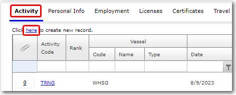 4. Click the 'Click here to create new record' link to create a new activity record. On the Activity screen, enter information in the following fields: