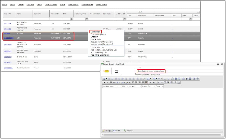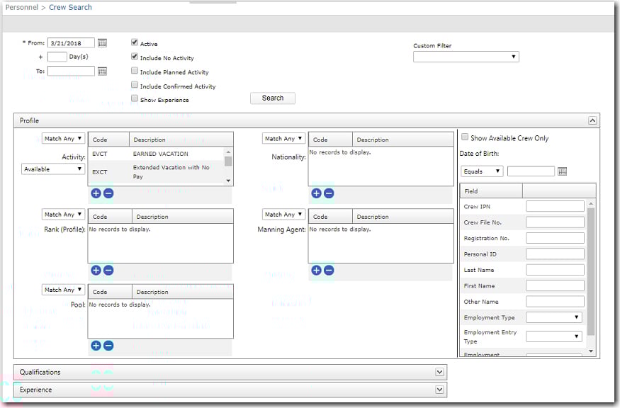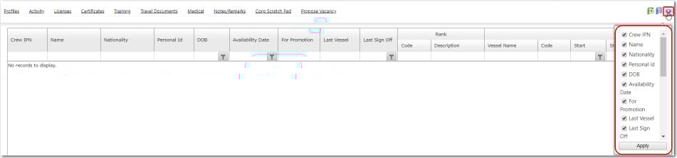 for crew members of a particular rank/s. Click the '+' icon to display a