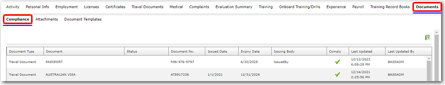 3. After you have loaded the crew profile record, click the Compliance sub tab under the Documents tab.