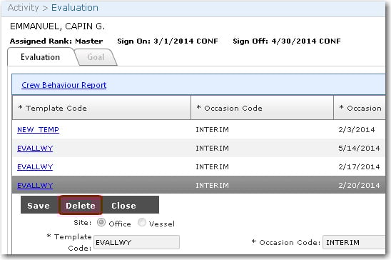 5. The selected crew member's evaluation details will then be displayed. Click Delete. Click Yes to confirm your intention to delete the selected record and it will then be removed.