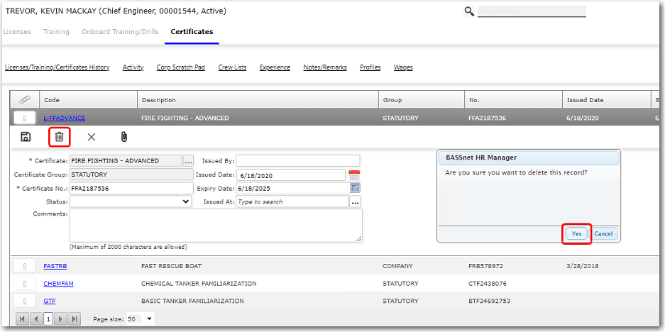 Note: Alternatively, without clicking the certificate code, on the Licenses/Training/Certificates screen, highlight the crew member's certificate record that you want to delete, and then click the trash bin icon at the top of the screen.