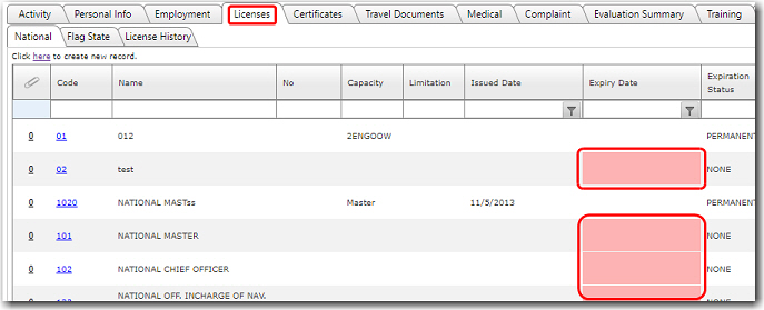 To check the expiry dates of licenses: 1. From the HR Manager main menu, click Profiles under the Personnel menu. 2. Ensure that the crew profile for which you want to check the expiry dates of licenses has been loaded. Note: To search for a crew member, enter part of the crew's name or ID in the Search Crew field above the profile picture, then select from the auto suggested results. Note: Alternatively, click the magnifying glass icon to open the Simple Search pop-up window. You can use the drop-down function to select and load a list from the Personnel List section and click a crew member from the Search Result section to view his profile, or search for specific crew member(s) based on their Name, Gender, Nationality, Pool, Rank, Manning Agent, and Active/Inactive status. 3. After you have loaded the crew profile record, click the National or Flag State sub tab under the Licenses tab. 4. The crew member's license records will be listed under the selected sub tab. If a license has expired, the date in the Expiry Date column will be highlighted in red.