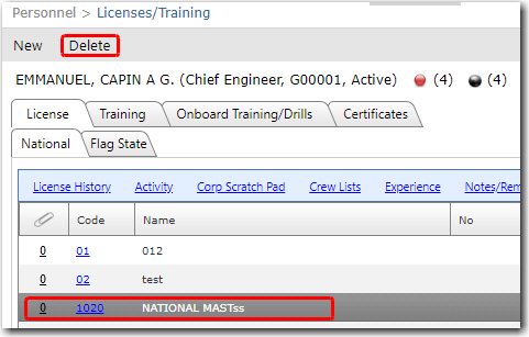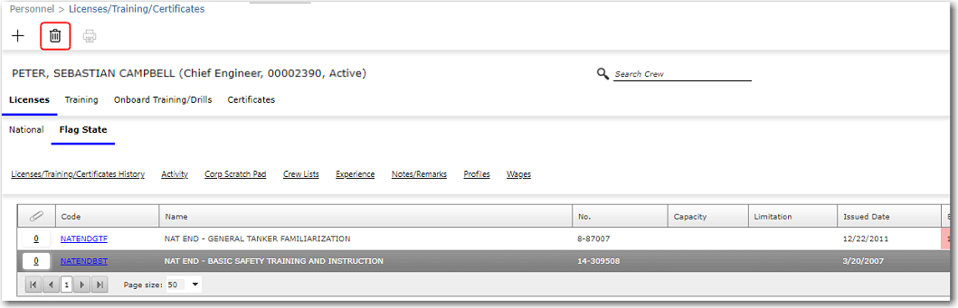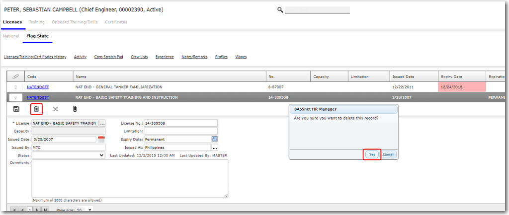 Note: Alternatively, click the magnifying glass icon to open the Simple Search pop-up window. You can use the drop-down function to select and load a list from the Personnel List section and click a crew member from the Search Result section to view his profile, or search for specific crew member(s) based on their Name, Gender, Nationality, Pool, Rank, Manning Agent, and Active/Inactive status. 3. After you have loaded the crew profile, click the National or Flag State sub tab under the Licenses tab, and then click the license code to open the license details. 4. When the details of the selected license code is displayed. Click the trash bin icon to delete the record, and then click Yes to confirm the delete, and the license record will be removed permanently. Note: Alternatively, without clicking the license code, on the Licenses/Training/Certificates screen, highlight the crew member's license record that you want to delete, and then click the trash bin icon at the top of the screen.