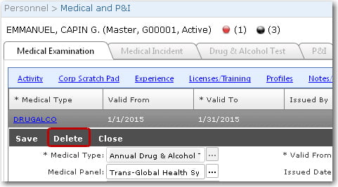 To delete a previously created medical record: 1. From the HR Manager main menu, click Profiles under the Personnel menu. 2. Ensure that the crew profile whose medical record you want to delete has been loaded. Use the Personnel search field to search and select the relevant crew profile. Note: To use a previously saved list of crew, click the search icon in the Personnel search field to use the Personnel List feature on the Simple Search window. Use the drop-down function to select and load a list from the Personnel List section and click a crew member from the Search Result section to view his profile. 3. After you have loaded the crew profile record, click the Medical Examination, Medical Incident or Drugs & Alcohol Test sub tab under the Medical tab. Click a particular record that you want to delete. Note: To delete a P&I claim record, access the record that you want to delete from under the P&I tab on the Medical and P&I screen. The following steps to delete a record will apply. 4. The selected crew member's medical details will then be displayed. Click Delete. Click Yes to confirm your intention to delete the selected record and it will then be removed from the table. Note: Alternatively, on the Medical and P&I screen, highlight the crew member's medical record that you want to delete. Click the Delete button at the top-left of the screen.