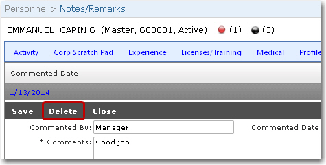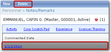To delete a previously created note/remark: 1. From the HR Manager main menu, click Profiles under the Personnel menu. 2. Ensure that the crew profile for which you want to delete a note or remark has been loaded. Use the Personnel search field to search and select the relevant crew profile. Note: To use a previously saved list of crew, click the search icon in the Personnel search field to use the Personnel List feature on the Simple Search window. Use the drop-down function to select and load a list from the Personnel List section and click a crew member from the Search Result section to view his profile. 3. After you have loaded the crew profile record, click the Notes/Remarks link. 4. On the Notes/Remarks screen, click the relevant record that you want to delete. 5. The selected crew member's crew note or remark details will then be displayed. Click Delete. Click Yes to confirm your intention to delete the selected record. Note: Alternatively, on the Notes/Remarks screen, highlight the record that you want to delete. Click the Delete button at the top-left of the screen.