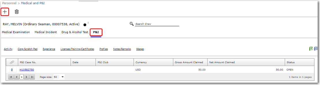 3. On the Medical and P&I screen, go to the P&I tab, and then click the + icon at the top to create a new P&I claim record.