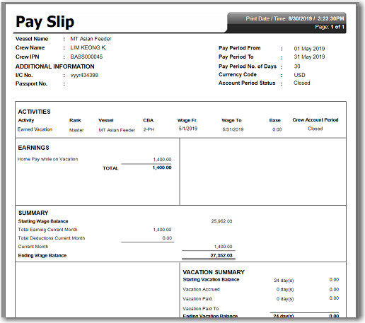 5. Click OK once you have made your selections. The crew member's payslip will then be generated. Note on YTD Gross Earnings: A back-end System configuration is available where, if the configuration is turned on, the Year to Date Gross Earnings amounts for records that are in a closed account period will be displayed in a generated payslip. Please note that this feature is a back-end database-controlled configurable feature. If you would like to explore the option of including this feature, please contact BASS Support. |