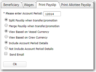 4. Enter the Account Period of the crew member's earnings and contributions that you want to print. Use the radio buttons to select whether you want to split or merge the payslip when the crew member is transferred or promoted, and whether you want to view the payslip based on vessel currency or crew currency.