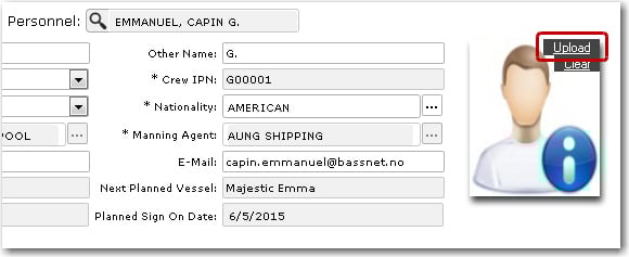 To attach a profile photo to a crew profile: 1. On the Profiles screen, ensure that the crew profile to which you want to attach a profile photo has been loaded. Use the Personnel search field to search and select the relevant crew profile. 2. Mouse-over the profile photo placeholder and an Upload link will be displayed. Click the Upload link. 3. The Upload Profile Picture pop-window is displayed. Click the Select button. 4. The File Upload window is displayed. Here, browse through your directories and select the profile photo file that you wish to upload and then, click Open. 5. The file path will then be displayed in the Upload Profile Picture window. Click Upload. Note: Click Remove to remove the selected profile picture. 6. The profile photo will be uploaded and displayed in the profile photo placeholder. 7. Click Save at the top of the page to save the changes you have made to this record. The profile photo you have attached will not be saved if you do not click the Save button. Note: If you want to change or delete the uploaded profile photo, mouse-over the photo placeholder and click Clear. This removes the current photo. You can then follow the instructions listed above to upload a new photo.