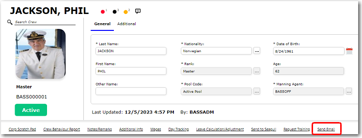 3. After you have loaded the crew profile record, click the Send Email link.