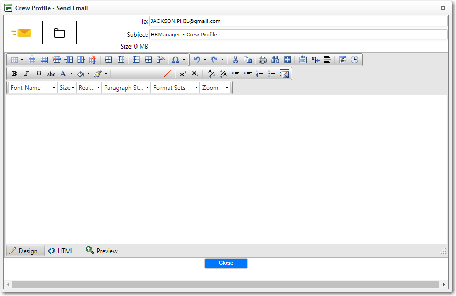 4. The Email pop-up window will be displayed. The To field will be automatically filled with the crew member's email, while the Subject will be defaulted as 'HR Manager - Crew Profile'. The email of the sender will automatically be included in the CC/BCC field. Enter the content of the email in the given field.