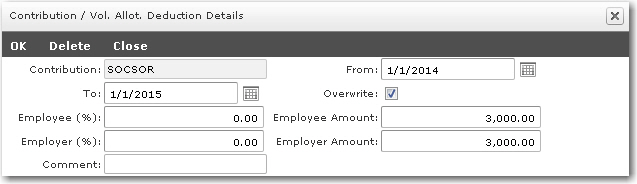 6. Click OK once done and move on to the Contribution/Vol. Allot. Deduction tab. 7. Under the Contribution/Vol. Allot. Deduction tab, a list of contributions and voluntary allotments that is to be made by this crew member is displayed. This information is retrieved from the Contribution/Allotment Deduction Register. To overwrite the current contribution/allotment amount, click the Contribution record to open the Contribution/Vol. Allot. Deduction Details window. Then, select the Overwrite check box and enter the Employee and Employer contribution amount manually. Use the Comment field to enter comments relating to the contribution. The From and To fields allow you to select validity periods to indicate multiple contributions/allotments at different periods. Note: A back-end configuration is available to disable the Overwrite check box (by entering the contribution code in the secondary value of the config). 8. Click OK once done and move on to the Comments tab. The Comments tab allows you to enter any comments pertaining to this wage record. 9. Click Save to save all your entries.