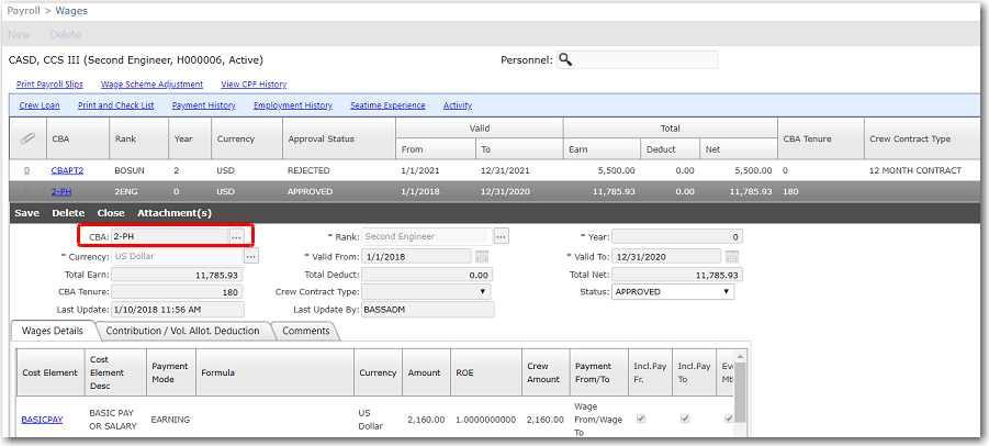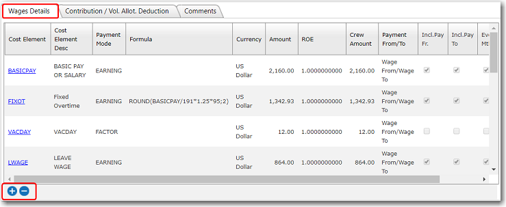This feature allows you to enter contractual wage details of a crew member. In the Cost Element section, the breakdown of the payroll is further defined into basic pay, fixed overtime, allowance and so on.