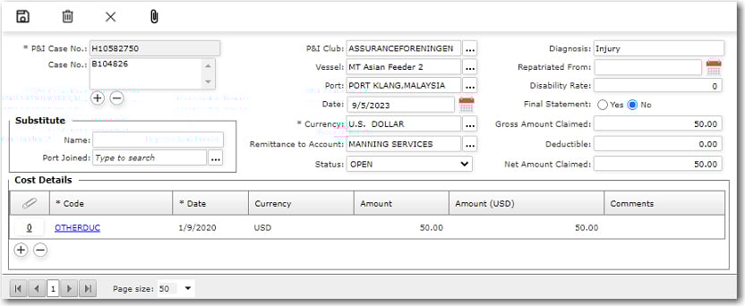 Click the '+' icon to link a case number from a medical incident record. The case number available for selection is that which has been entered under the Medical Incidents tab and the P&I Case check box has been selected. The medical incident record will need to be approved before the case number can be made available for selection.