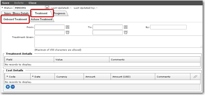 5. Click the Treatment tab to view or edit information about the treatment received by the crew member. If the crew member received treatment onboard, the information will be under the Onboard Treatment sub tab: