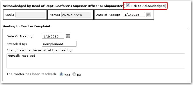 4. You can then view the description of the complaint in the given field, detailing the date, time, place of event and persons or witnesses involved in the complaint. 5. In the Declaration section, the complainant's signature is entered to declare the complaint. Note: To enter a complaint on a crew member's behalf, select the ‘Tick to Represent’ check box in the Complainant's Representative's Particulars section of the form and sign in the representative's name. Note: A crew member who has an existing complaint record can also click his own complaint record (when logged into the System) and then click New to create a new complaint, if required. The crew member’s name will be automatically displayed in the Declaration section. 6. The Head of Department/Supervisor/Master can acknowledge the complaint by clicking the record and selecting the ‘Tick to Acknowledge’ check box. He can further enter information such as the date the meeting was held with the complainant, a brief description of the result of the meeting and the outcome of the meeting.