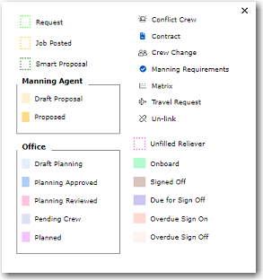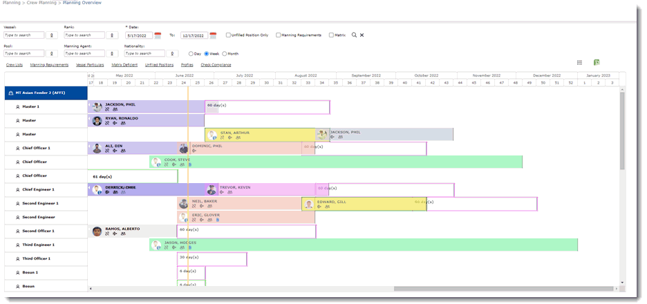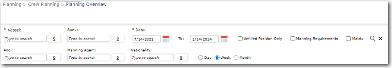 To view an overview of planned crew: 1. From the HR Manager main menu, click Planning Overview under the Planning menu. 2. The Planning Overview screen is displayed. Select the Vessel(s) for which you are planning. 3. Use the search fields to carry out a search for the planned crew you want to view. In the Date and To date fields, enter a date range within which the search should be carried out. 4. Then, in the Vessel field, select the Vessel/s that you want to display in the Planner. You may make your selection from the Vessel Lookup window as well. Alternatively, if you do not make a selection here, then planned crew from all vessels will be displayed. 5. In the Pool and Manning Agent field, you can filter the overview of the crew planning that you have carried out for you vessel by Pool or Manning Agent, respectively. 6. In the Rank field, you can choose to narrow the crew that will appear in the planner based on their Ranks. Only the Ranks selected will be displayed in the planner. Alternatively, if you do not make a selection here, then all Ranks for which activities have been planned within the specified date range will be displayed. 7. Finally, in the Nationality field, you can filter the overview of the crew planning by Nationality. You can also select the Unfilled Positions Only check box to only display vacant positions. This is to make it easier for you to plan and assign crew for unfilled positions. Select the Manning Requirements check box to allow the system to check the manning requirements for the selected vessel(s) based on the setup on the Manning Requirements screen. The numbers displayed next to the ranks indicate the number of positions required for that particular rank. Select the Matrix check box to allow the system to check based on the setup on the Manning Requirements screen. 8. Click the Search icon. The planned crew based on your search criteria will be displayed in the Planning Overview. (Note: The information displayed can be sorted by Vessel. The sorting of these vessels will follow the Sequence Number and then the Vessel Name, as setup on the Vessel Particulars screen of each Vessel.) Click the Legend icon to help you quickly see the status of the crew planning activities in the Planner.