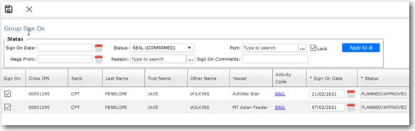 3. Office users can then right click on the boxes that were filled by Smart Proposal and change the status of the activity. Export the Planner: Click the Export to Excel icon on the Planning Overview screen to export the currently displayed planner (based on your search criteria) by vessel or rank, respectively, to a Microsoft Excel file. Display crew members on multiple vessels: If you have selected more than one vessel, then the crew members will be displayed for the multiple vessels. Crew rotating on all the selected vessels will be displayed as well:
