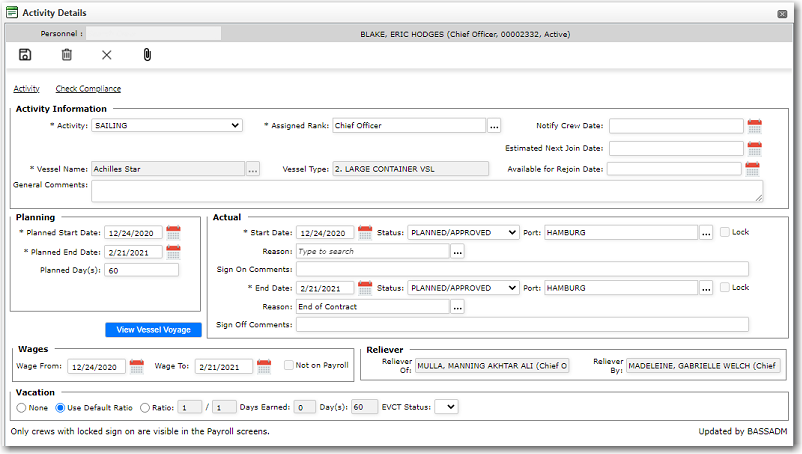 View Details: You can mouse-over a crew member's name in the planner to view the details of his schedule for a particular period, for instance, to check if the crew member will be sailing or on a course on that date. Comments made on the Activity Details screen are also displayed in this pop-up.