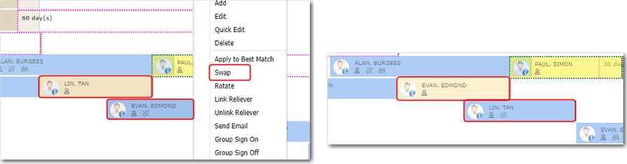 Make Adjustments: You can make date adjustments as required by dragging the side of the timeline of a particular crew member. Please note that you can only make adjustments based on future dates. Any changes made will be automatically reflected in the crew member's Activity records after you save the change. You can also drag the entire timeline to a different role or vessel if required. You can also select two timelines, right click and click Swap to swap the crew members selected for both timelines (see section below).
