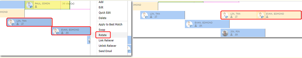 Select two timelines and click Swap to swap the crew members selected for both timelines You are not allowed to swap for confirmed/past activities Rotate: